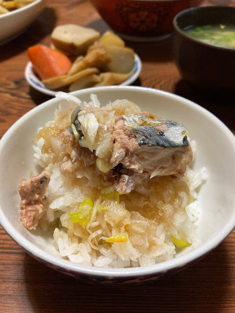 ウチでは「鯖大根」と呼んでいる大根おろしに鯖缶を開けて刻んだネギをのせ、それを炊き立てのご飯の上に乗せ、醤油をかけて食べる。